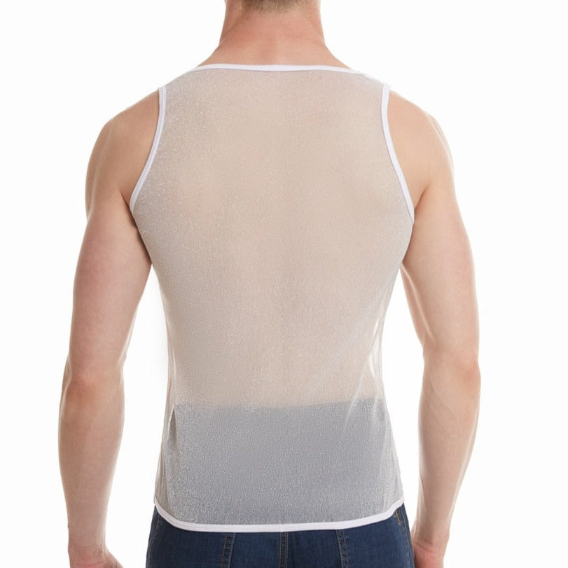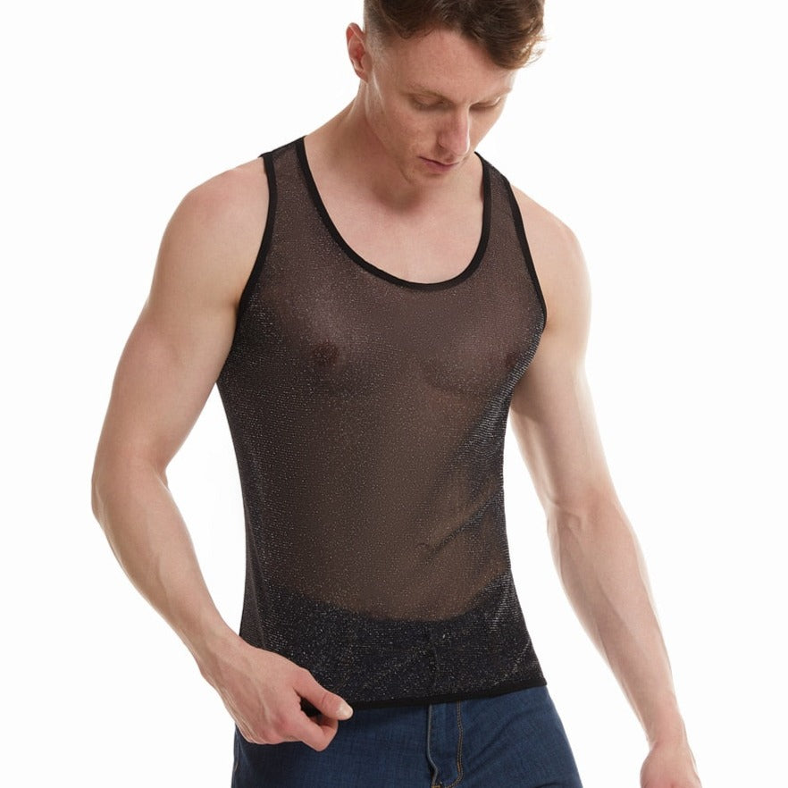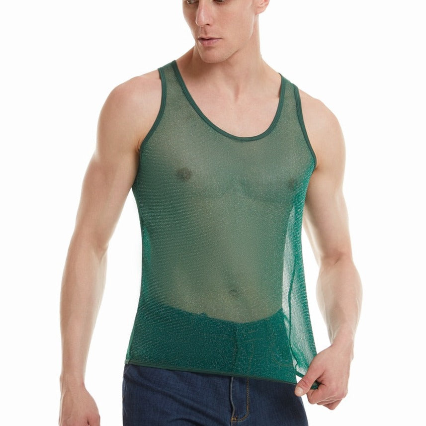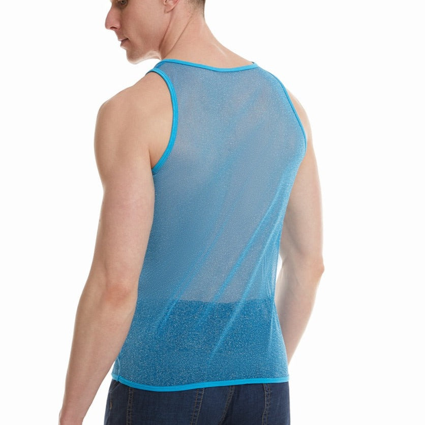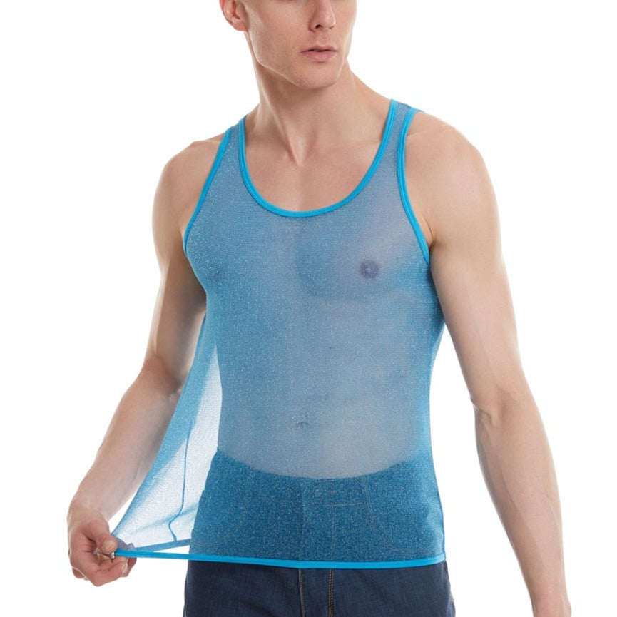 These fun and flamboyant tank tops will make you the center of attention! They're completely see-though. sparkly. and come in a variety of vibrant colors. Perfect for guys with nothing to hide!