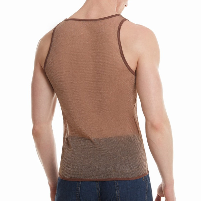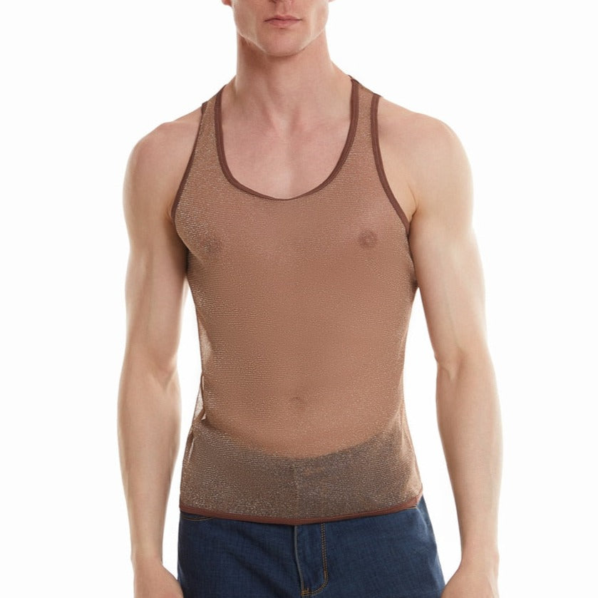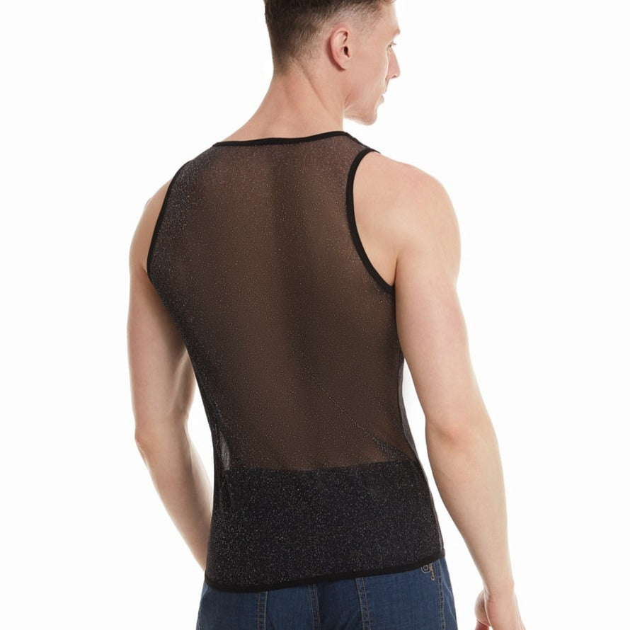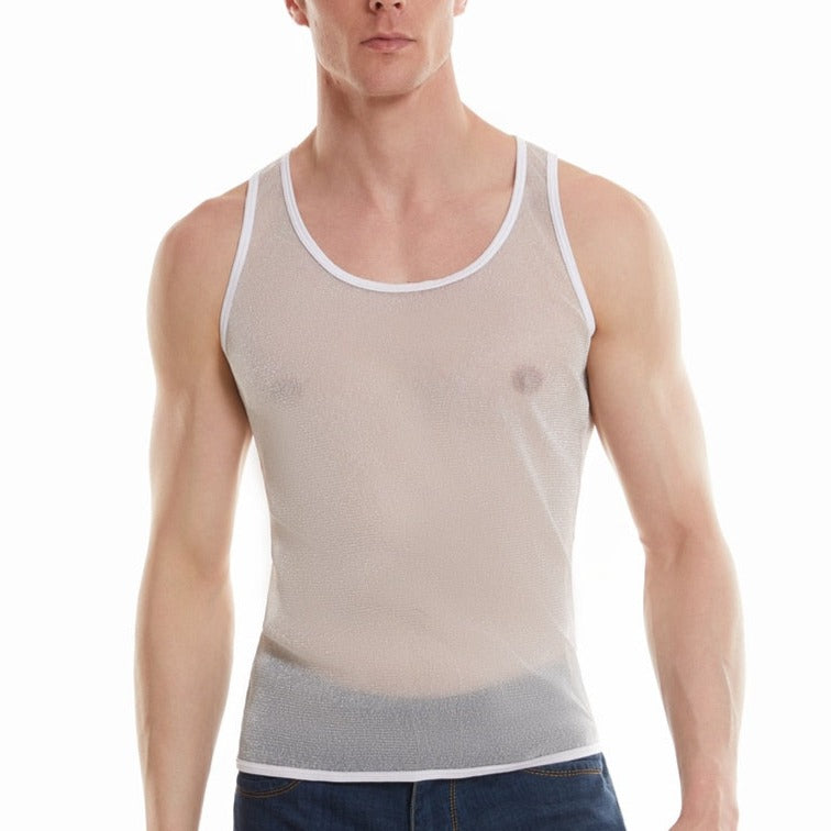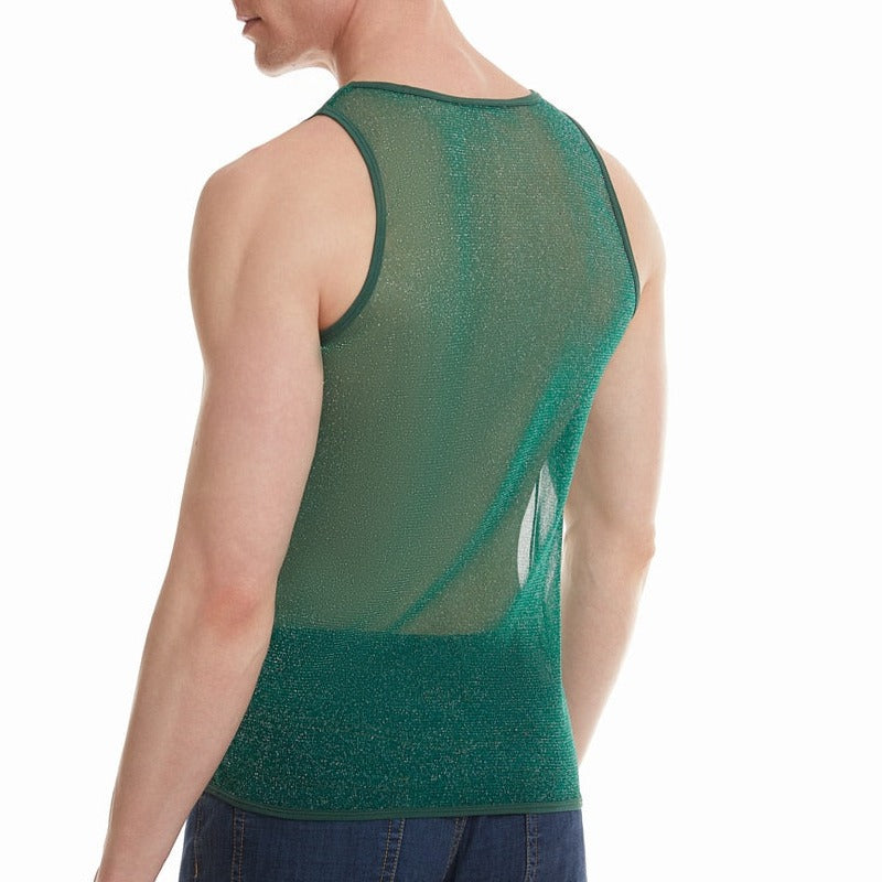 These fun and flamboyant tank tops will make you the center of attention! They're completely see-though. sparkly. and come in a variety of vibrant colors. Perfect for guys with nothing to hide!