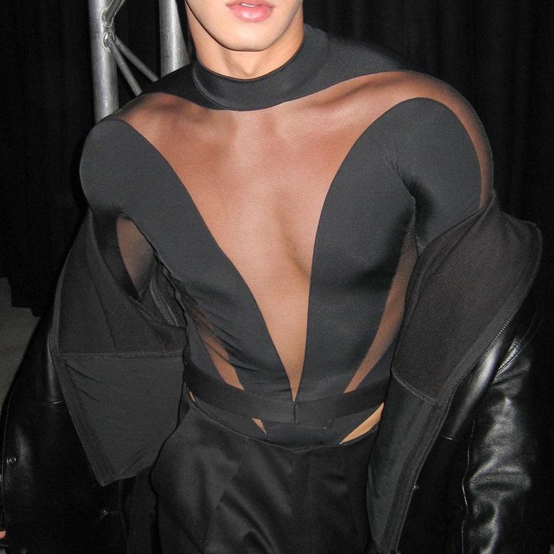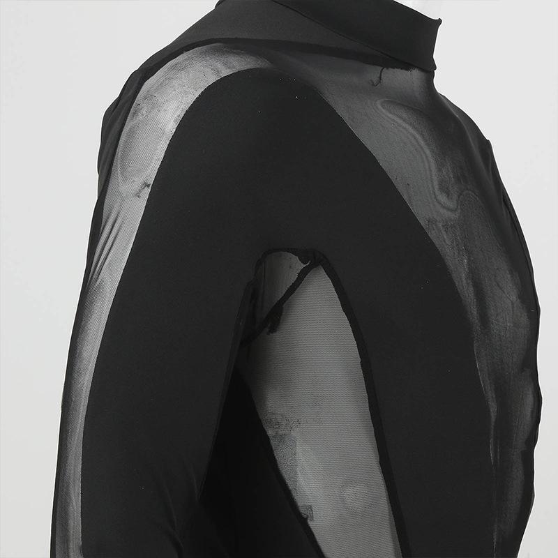 Patchwork mesh long sleeve crewneck button bodysuit
